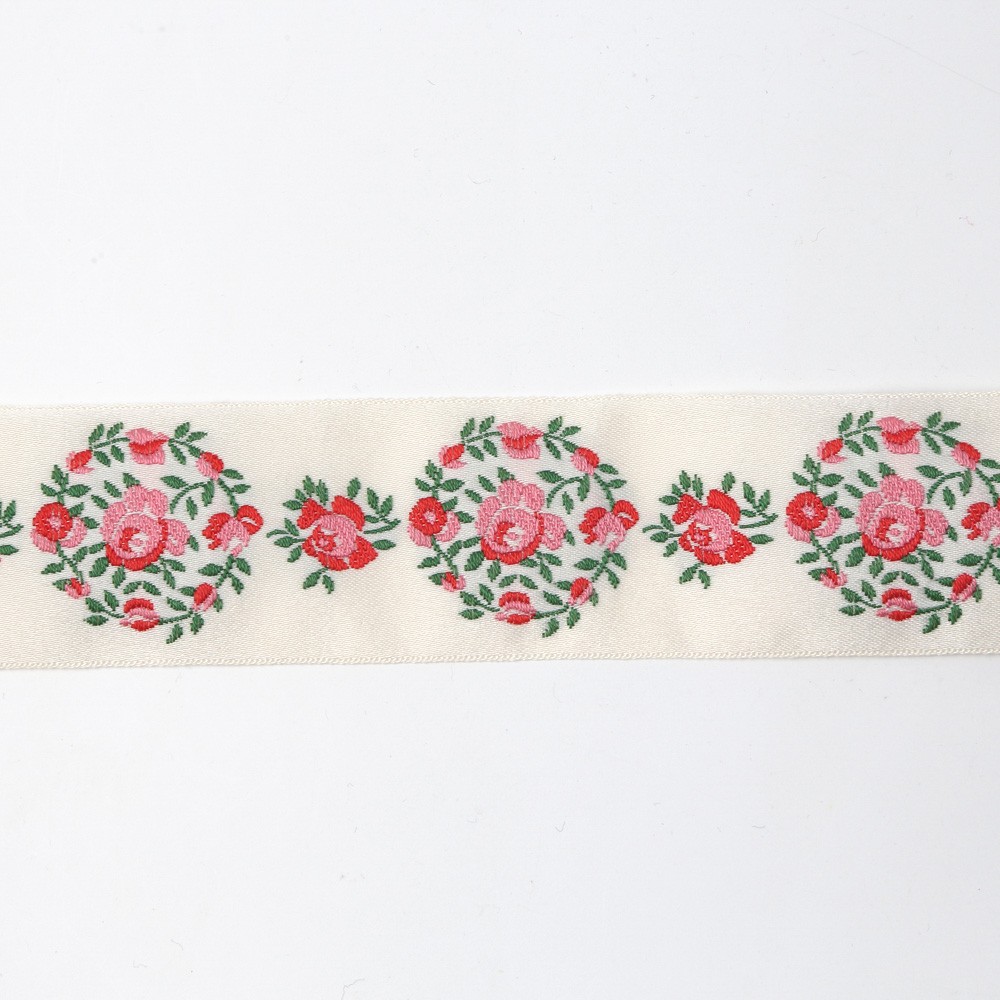こちらはドイツ製のジャガード織りのリボン。カフカ夫人によって閉鎖された工場の技術が復刻され、今ではカフカリボンとして知られています。幅3.5cmのリボンです。こちらは白地にシックで可憐な赤い薔薇のリースが織り込まれています。清潔感のある美しいお柄です。100年以上古い織り機を使ってパンチカードにより昔ながらの製法で作られている美しくかわいいリボンです。幅3.5cmですのでバッグなどにアクセントとして使われると素敵です。直で仕入れていますので、日本で購入いただくよりお求め安い価格でご提供です。素材もコットン90%、ポリエステル10%で品質のよいものです。アイロンをかける際はポリエステルを選択してください。