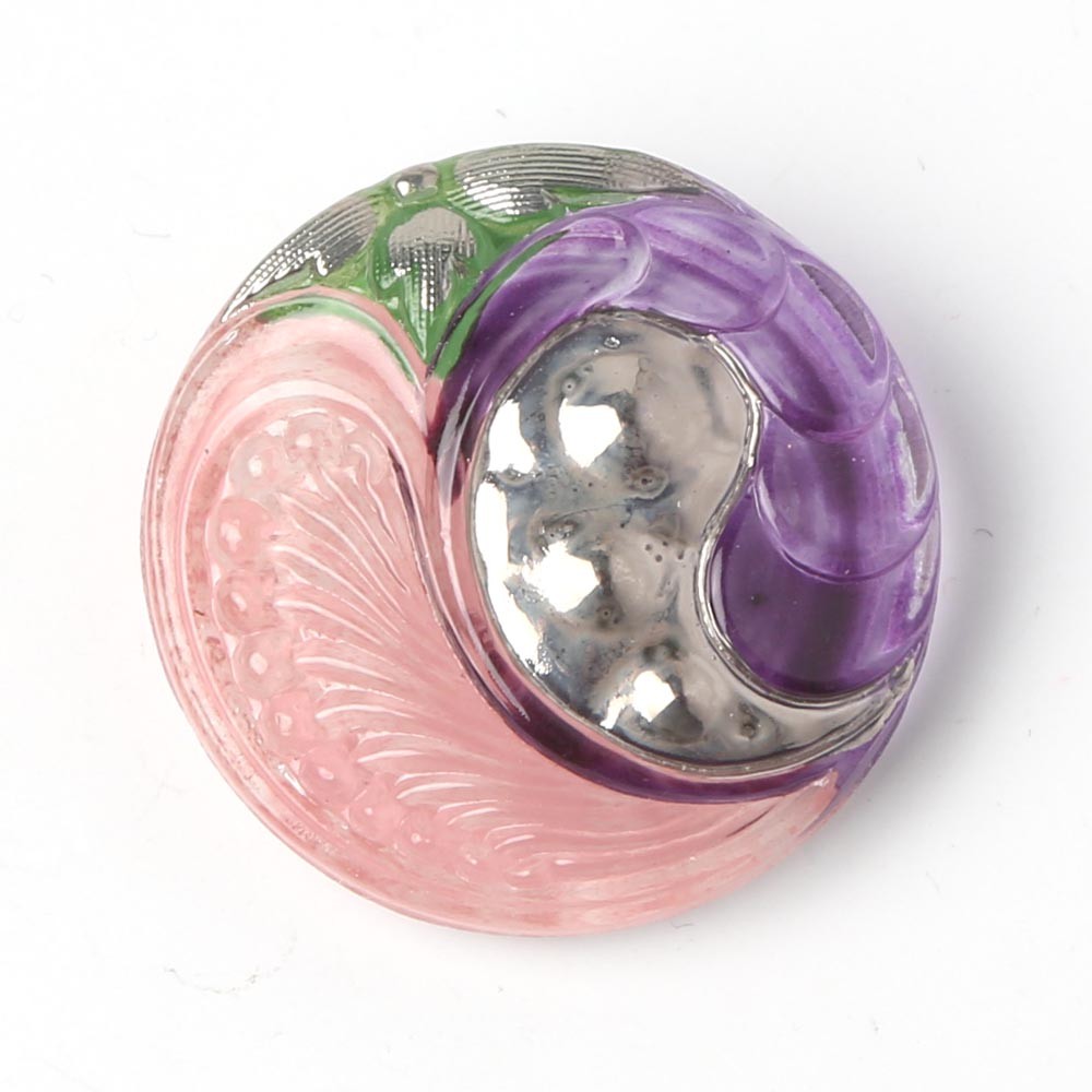 こちらは北チェコで長い間製造されてきたガラスボタンで、ひとつひとつ手で打ち出され彩色も職人さんによる手作業でのもの。世界中で愛されるのチェコのガラスボタンの最高峰です。こちらはアールデコを思わせるような優雅な曲線を描く植物がモチーフになったペーズリーのデザイン。アシメトリーなデザインもまた素敵です。透明のガラスに裏から彩色され、爽やかなパープルとピンクとグリーンの組み合わせ。表には銀彩が施され、華やかで個性的な仕上がりになっております。大きさも2.7cmとかなり大きめですので留め具やブローチなどに大変おすすめです。