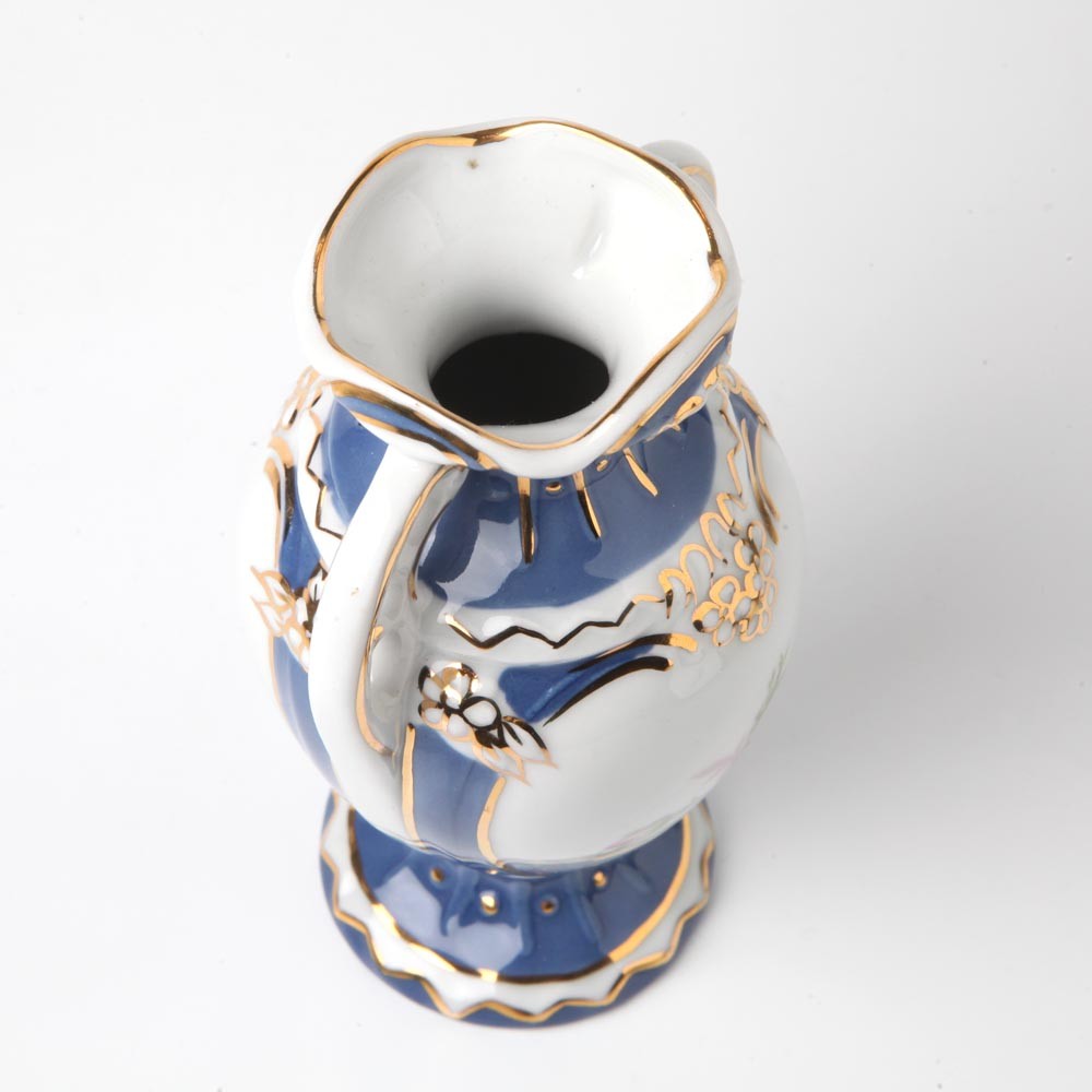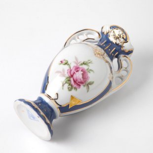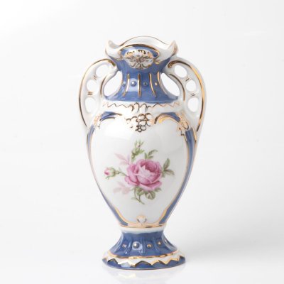 こちらは1853年からの歴史があるチェコの老舗陶磁器メーカーロイヤル・ドゥクスの定番商品、ロココ調のスタイルを持つエレガントな花瓶です。かつては高級なインテリアとしてこちらのメーカーの磁器製品がご家庭の飾り棚などに良く見られたものです。バラのプリント、濃いめの水色と金のラインがキリッと美しい磁器です。金色のラインは手書きで職工さんが丁寧に入れています。また金のラインは本物のゴールドが使用されています。家庭で大事にされていた物が多いため、アンティークショップでも状態のいいものが多いのが特徴です。こちらも金の色の剥げなどもなく状態もとても良いものです。優雅で華やかな印象で、どこにおいても素敵なデコレーションになります。存在感と味わい深い雰囲気があります。口の部分に一点製造過程で入ってしまう黒い点が見られます。