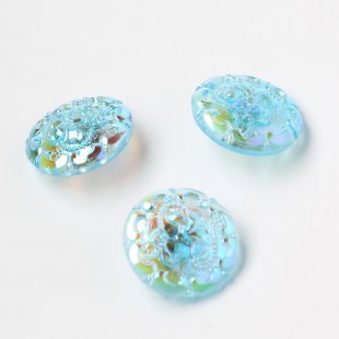 こちらは北チェコのガラスボタン工房で作られている手打ちボタン。こちらのボタンは直径が約2.2cmのボタンです。こちらのボタンは、中央が盛り上がったポッコリとした形のガラスボタンです。表面にはバロックスタイルでお花とフレームの装飾が施されています。透明ブルーのガラスを使用していますが、表面からうっすら金属塗料が塗布され、淡い虹色のニュアンスもあります。優雅で涼やかなガラスボタンです。アクセサリーへの材料や洋服のボタンにお勧めです。