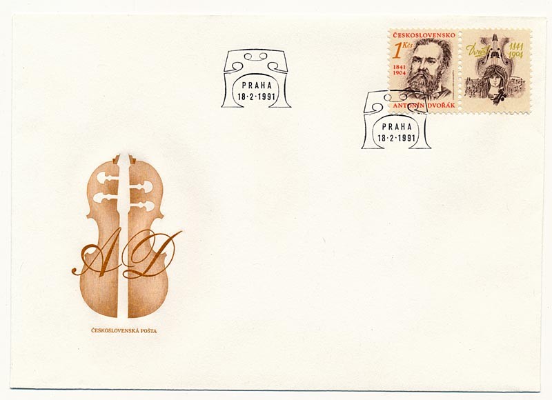 こちらは1991年チェコスロヴァキア時代のプラハで発行されたFDC封筒。アントニーン・ドボルザークをモチーフにした封筒です。ヴァイオリンにADのイニシャルが入ったイラストが凹版印刷でプリントされています。また切手はドボルザークの肖像画と音楽の女神と音符を描いたモノクロームの素敵なデザインのものです。傷みもなく状態も良好です。チェコの音楽ファンにはおすすめの一枚です。