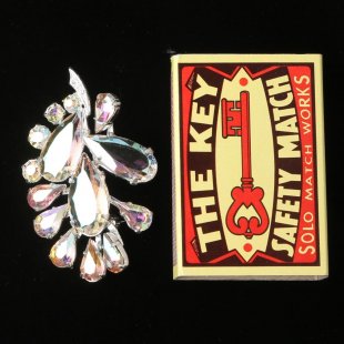 こちらはチェコスロヴァキア時代のヴィンテージブローチ。ラウンドと雫型のクリスタルカットガラスで構成された植物モチーフのブローチです。表面には金属塗料が塗布されているため、うっすらと虹色のニュアンスでキラキラと輝く優雅なブローチです。パッと人目をひく華やかさがあり、色々な場面でご活用いただけると思います。また、茎の部分には小さなクリスタルガラスもあしらわれ、なかなか手の込んだ作りのブローチです。ピンの状態も含めて、全体の状態も良好です。