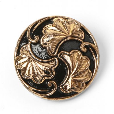 こちらは北チェコのガラスボタン工房からのガラスボタン。黒いガラスに表面は大胆な銀杏の葉のようなリーフがあしらわれています。ゴールドの彩色が施され、大人っぽいシックな雰囲気。少しアールデコの雰囲気もあります。ジャケットのボタン、飾りボタン、また髪留めなどアクセサリーの材料にも。