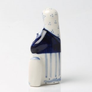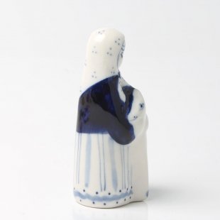 こちらはロシアの老舗磁器メーカー、グゼル社の磁器の置物。藍と白を特徴とするロシア民藝磁器製品を長い間製作してきた会社です。こちらはスカーフを被った可愛らしい少女が仏時を抱いて佇むワンシーンを磁器に表現したものです。ゆっくりとした静謐な時間を感じさせるような優しい雰囲気が魅力です。少し傾げた頭がなんともおっとりしてキュートな雰囲気です。片手に載るほどの大きさで、どちらでも飾っていただけます。玄関先や窓辺、インテリア棚にいかがでしょうか。大体1980-90年代のお品です。