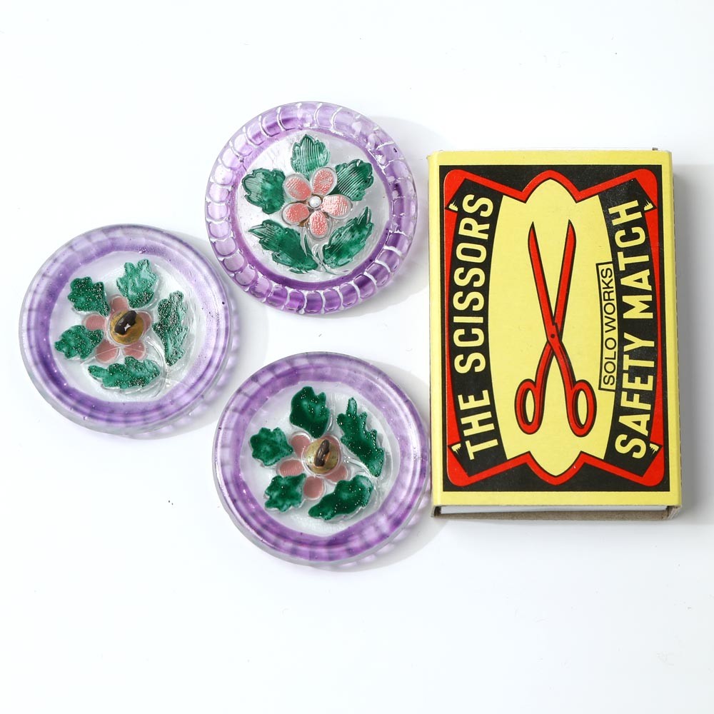 こちらは北チェコのガラスボタン工房の新作のボタン。在庫にある古い型を使用して新しく制作されたものです。大きな3.2cmのボタンで、透明のガラスを使用しています。中央には一輪のピンクの花、周辺はパープルの円環が施されています。ガラス自体の涼やかな質感もお楽しみいただける素敵なボタン。帯留め、髪留め、留め具などにおすすめです。裏と面と両面から職人さんの手により彩色された、工芸品としてのチェコのガラスボタンです。
