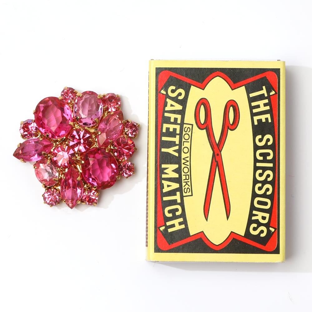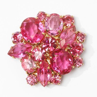 こちらはコスチューム・ジュエリー工房からのカットガラスのボタン。発色の良いピンク色で形も大きさも様々なカットガラスを13個使い大変豪華なガラスボタンです。またこちらのボタンは特に台座を金メッキで仕上げていますので、より美しい仕上がりです。こちらでも貴重なブローチに匹敵するガラスボタンです。