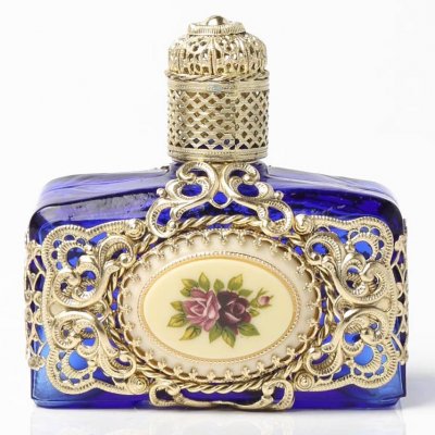 こちらはチェコで伝統的に製作されているガラスの香水瓶。深海ブルーのお色のガラス瓶にはフィリグリーの豪華な帯が装着されています。バロック調でふくよか、立体感のある美しいフィリグリーです。また中央にはブローチのような磁器製のバラの飾りが。女性的でとても優雅な雰囲気の香水瓶です。また瓶だけで160gを超え、当店で他でご紹介している3800円の香水瓶とは重量が3倍以上も差がある大きな瓶です。鏡台のお供に毎日素敵な気分を味わえると思います。職人さんが丁寧に手作りしているもので、手作りの温かみも感じられるチェコならではの工芸品です。