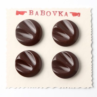こちらはヴィンテージ・カゼインボタンの4つセット。カゼインという素材はミルクプラスチックと言われる古いタイプのプラスチックで牛乳に含まれるカゼインで作られています。チェコではカゼインボタンは1970年代に生産が終了していて貴重なボタンです。飛ぶ鳥をデザインしたような抽象的なデザインが美しいボタン。お色はチョコレートのような焦茶色です。カゼインのつるっとした光沢がレトロで懐かしい感じもします。1950-60年代のボタンです。ヴィンテージですので、表面に少し擦れが見られます。
