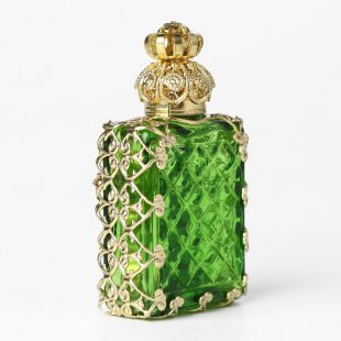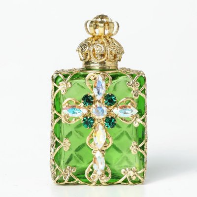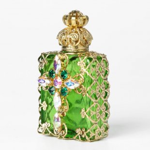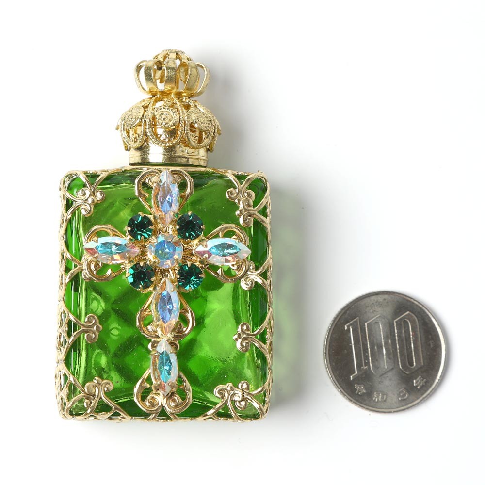 こちらはチェコのガラス製香水瓶で昔から作られているチェコスロヴァキアでは定番の商品。ガラスを型にはめてフォーミングする製法で作られています。また、北チェコの工房で一つの家族が丁寧に手作業で製作している工芸品的な香水瓶です。草色の透明なガラスを使用した瓶にレースのようなゴールドの金属カバー、中央にはカットガラスでクロスのモチーフがあしらわれた豪華な作りの香水瓶です。クロスのカットガラスは金属塗料が塗布された虹色のニュアンスがあり、キラキラと華やかに輝きます。また蓋には内部にガラス棒が付いていて香水に浸る感じになります。お気に入りの香水を小分けにして携帯することも可能です。また、棚などに飾ると華やか抜群で可愛らしいインテリア・アイテムになります。新品&ノスタルジックな香水瓶、とてもチェコらしい一品です。またプレゼントとしてもおすすめです。